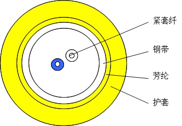 煤矿用室内光缆使用Φ600µm阻燃紧套光纤作为光传输介质,采用不锈钢软管来增强光缆的抗扭转性能,外覆一层芳纶作为受力加强单元,最外挤制一层低烟无卤材料(LSZH,低烟、无卤、阻燃)护套而成。