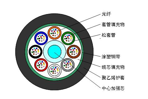 GYTS光缆的结构是将250µm光纤套入高模量材料制成的松套管中,松套管内填充防水化合物。缆芯的中心是一根金属加强芯,对于某些芯数的光缆来说,金属加强芯外还需挤上一层聚乙烯(PE)。松套管(和填充绳)围绕中心加强芯绞合成紧凑和圆形的缆芯,缆芯内的缝隙充以阻水填充物。双面涂塑钢带(PSP)纵包后挤制聚乙烯护套成缆。