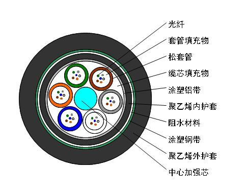 娱乐中心 GYTA53光缆的结构是将250µm光纤套入高模量材料制成的松套管中,松套管内填充防水化合物。缆芯的中心是一根金属加强芯,对于某些芯数的光缆来说,金属加强芯外还需挤上一层聚乙烯(PE)。松套管(和填充绳)围绕中心加强芯绞合成紧凑和圆形的缆芯,缆芯内的缝隙充以阻水填充物。涂塑铝带(APL)纵包后挤一层聚乙烯内护套,双面涂塑钢带(PSP)纵包后挤制聚乙烯护套成缆。