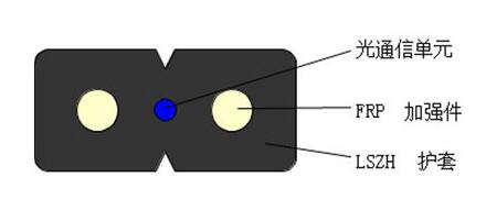 接入网用蝶形引入室内光缆是将光通信单元处于中心,两侧放置两根平行非金属加强元件(FRP),最后,挤制黑色或彩色低烟无卤护套成缆。